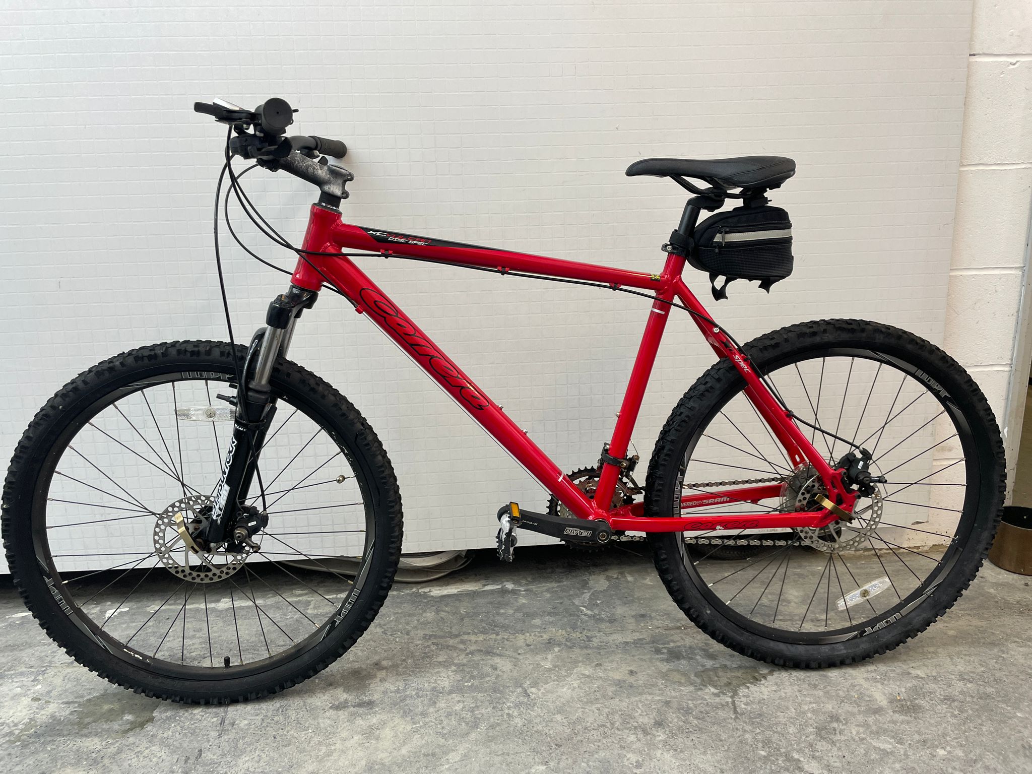 This is a red and black Canyon mountain bike designed for trail riding and outdoor adventures. It features a sturdy frame with a sleek design, front suspension for absorbing shocks on rough terrain, and knobby tires for excellent traction. The bike is equipped with multiple gears and a reliable drivetrain, making it suitable for various trail conditions. The comfortable saddle and ergonomic handlebars provide a smooth and enjoyable riding experience, whether for casual rides or more challenging mountain trails.
