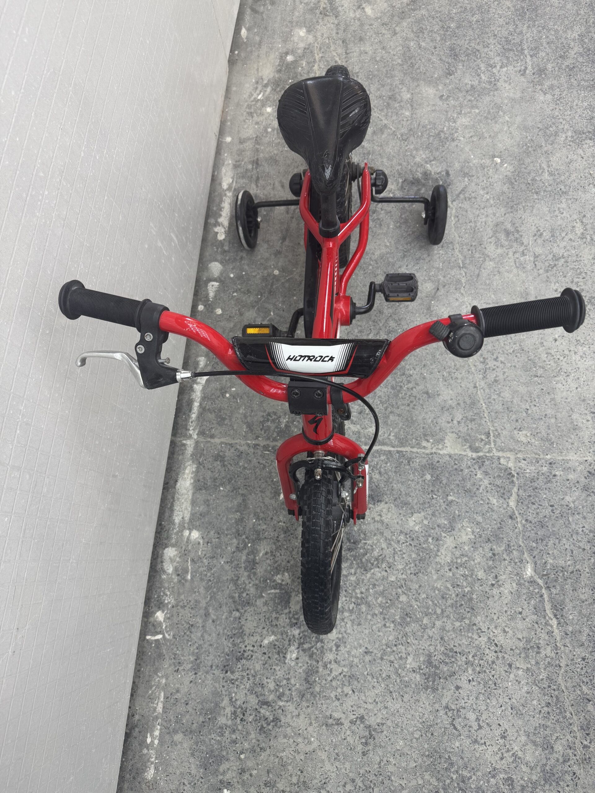 This is a red and black Specialized Hotrock kids’ bike designed for young riders and outdoor fun. It features a sturdy frame with a sleek design, front suspension for smooth rides over rough terrain, and knobby tires for good traction. The bike is equipped with training wheels for added stability, a comfortable saddle, and ergonomic handlebars, making it perfect for children learning to ride and exploring the outdoors.