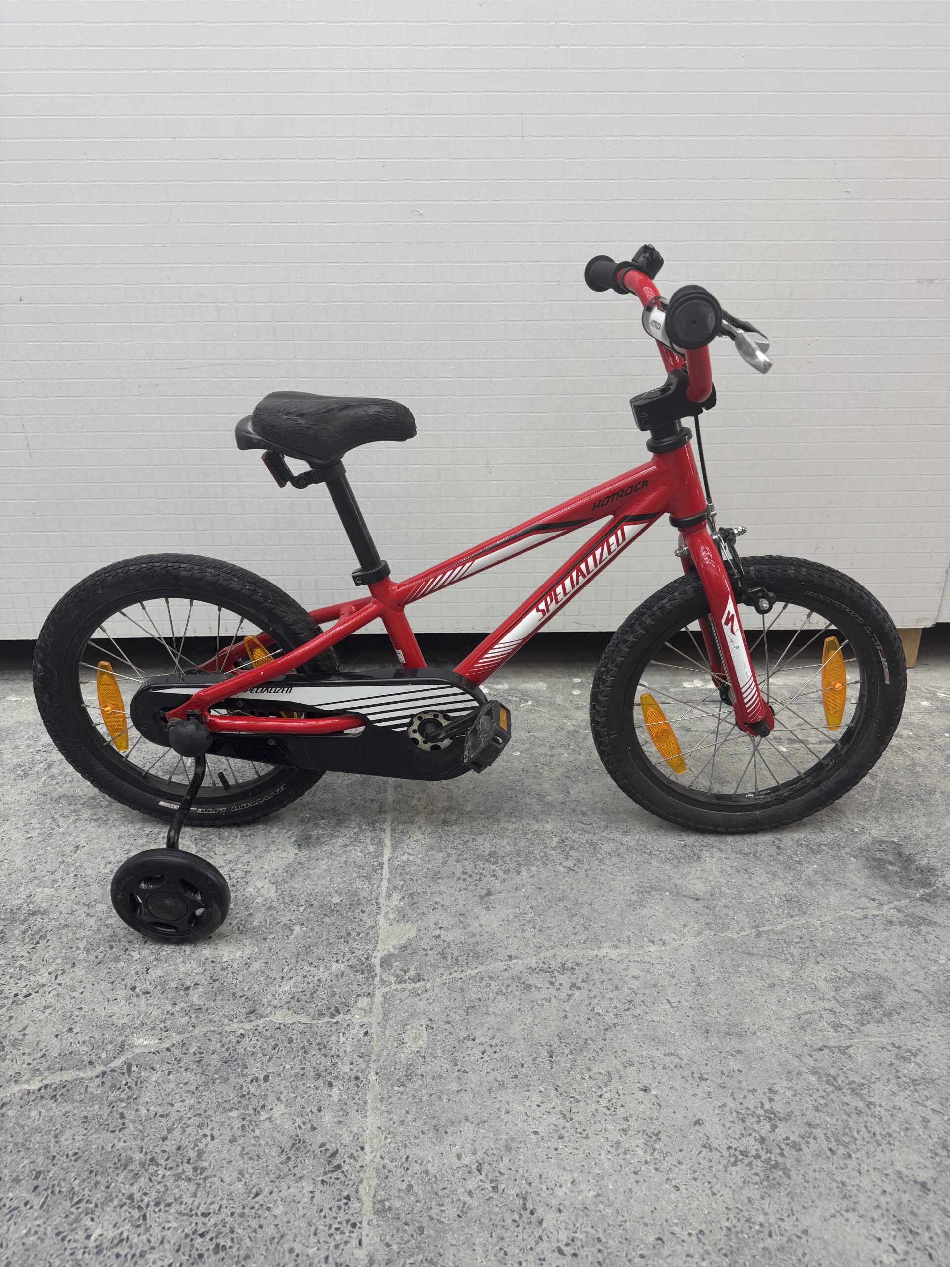 This fantastic Specialized Hotrock 16 is an excellent choice for young riders ready to explore trails or simply enjoy spirited rides! It features a sleek black frame with bold red accents, equipped with front suspension to soak up bumps and provide a comfortable experience on varied terrain. With its multi-speed gearing, your child will be able to navigate ascents and cruise on flats with ease, while the reliable V-brakes ensure confident stopping power. Everything works as it should – ready for its next cycling adventure and building their confidence!